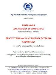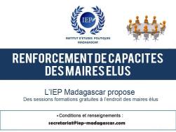 Le dernier événement marquant la vie politique nationale étant les élections municipales, l’IEP a non seulement élaboré un guide pour une campagne électorale réussie pour tous les candidats mais propose également une formation pour le renforcement de capacités des Maires nouvellement élus quels que soient leur parti politique et leur Région d’origine. C’est une grande première également dans les annales des élections municipales et des universités privées à Madagascar.